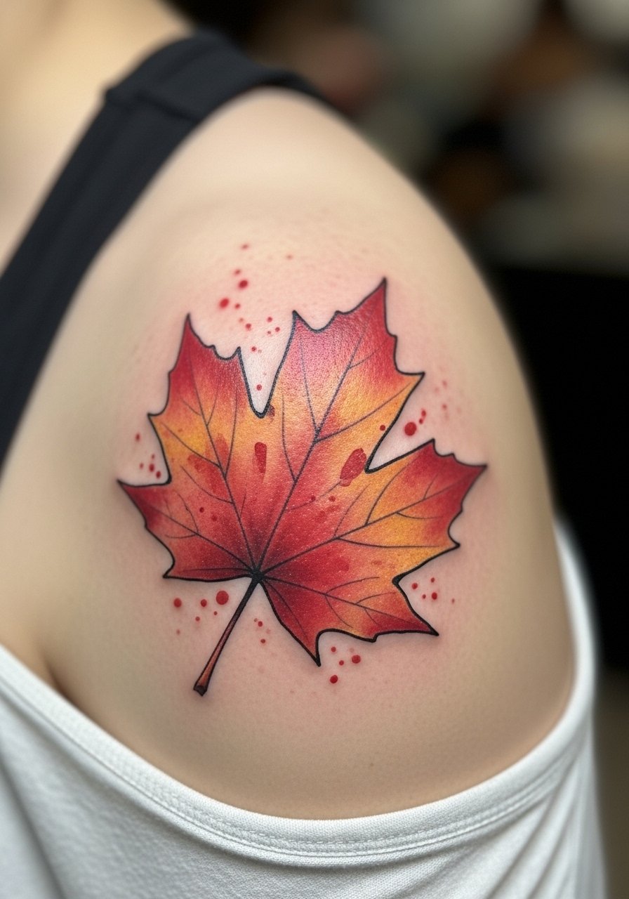 A painted maple leaf on the shoulder channels seasonal calm. Shoulder placement is forgiving and suits flowing color blends. Watercolor edges can fade, so pair them with subtle black anchors if you want long-term definition. Healing is straightforward—keep the area moisturized and shielded from sun. If you want true vibrancy, ask to see healed watercolor examples at similar skin tones so you know how pigments settle.