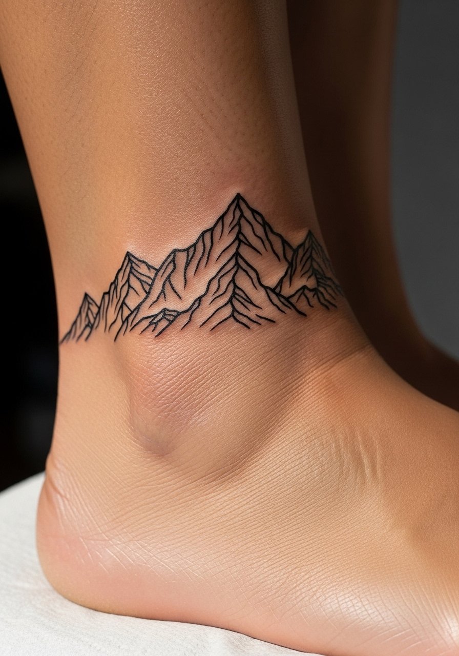 An alpine linework ankle cuff reads like a portable horizon. The cuff format is great for small nature tattoos that still make a statement. Ankle sensitivity is moderate; keep footwear loose during healing. A common error is overcompressing peaks—allow negative space between mountain lines so the silhouette stays crisp. Artists who show healed linework bands will help you select the right line weight.