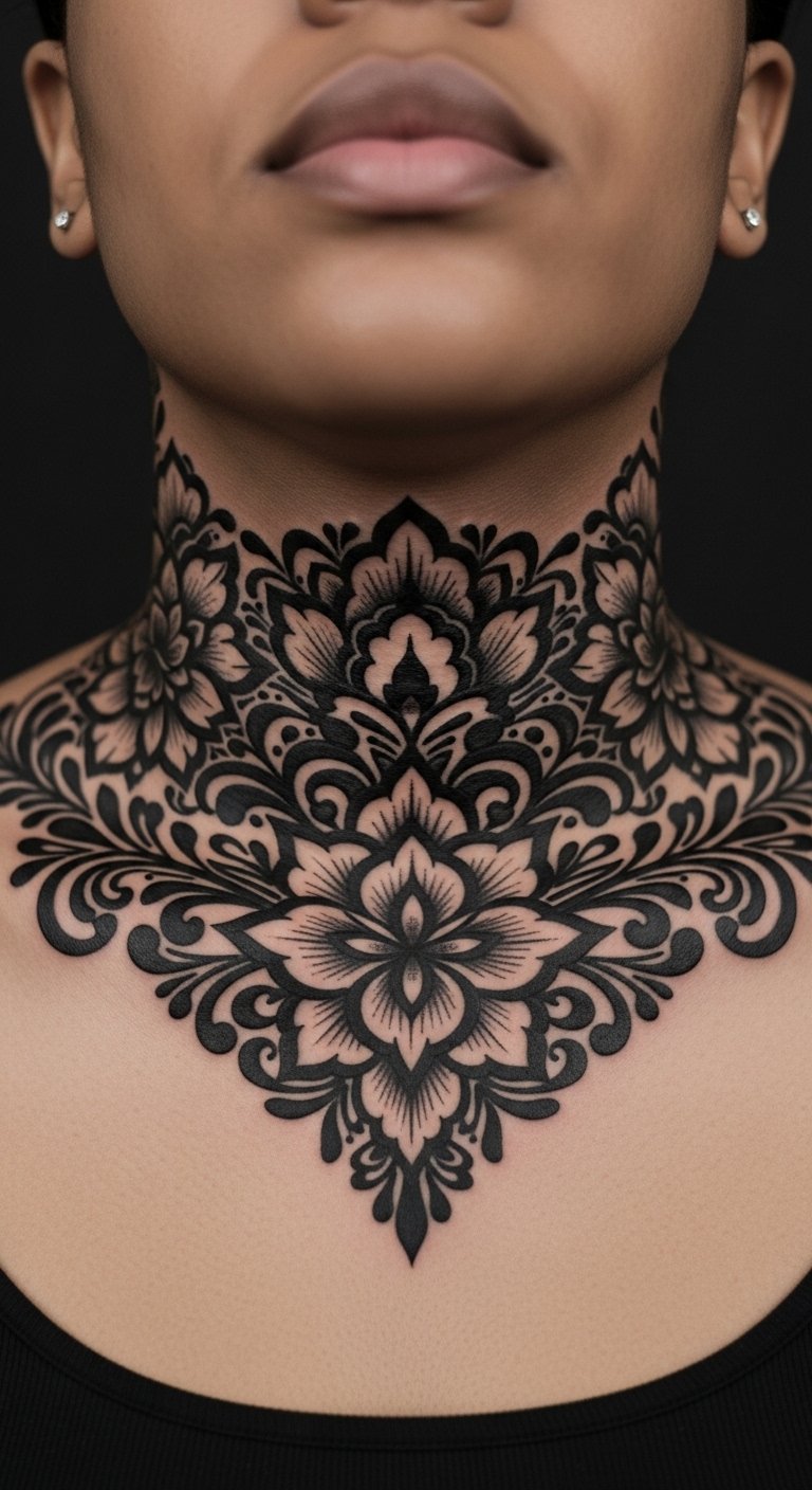 A tribal band across the throat is visually strong. Symmetry is crucial. Expect longer sessions and more pain. Healing needs attention to scabbing. Ask for mapping to ensure pattern sits evenly with movement.