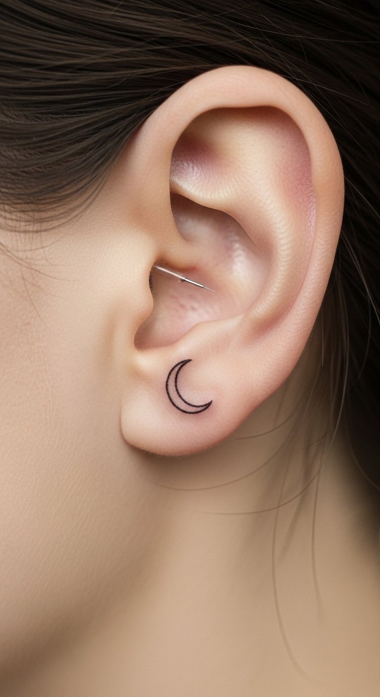 Behind-ear tattoos are tiny but painful. Single-needle crescents look refined and are discreet. Healing can be tricky—avoid sleeping on that side. The biggest mistake is choosing too small a motif; opt for slightly larger line weight so it reads after healing.