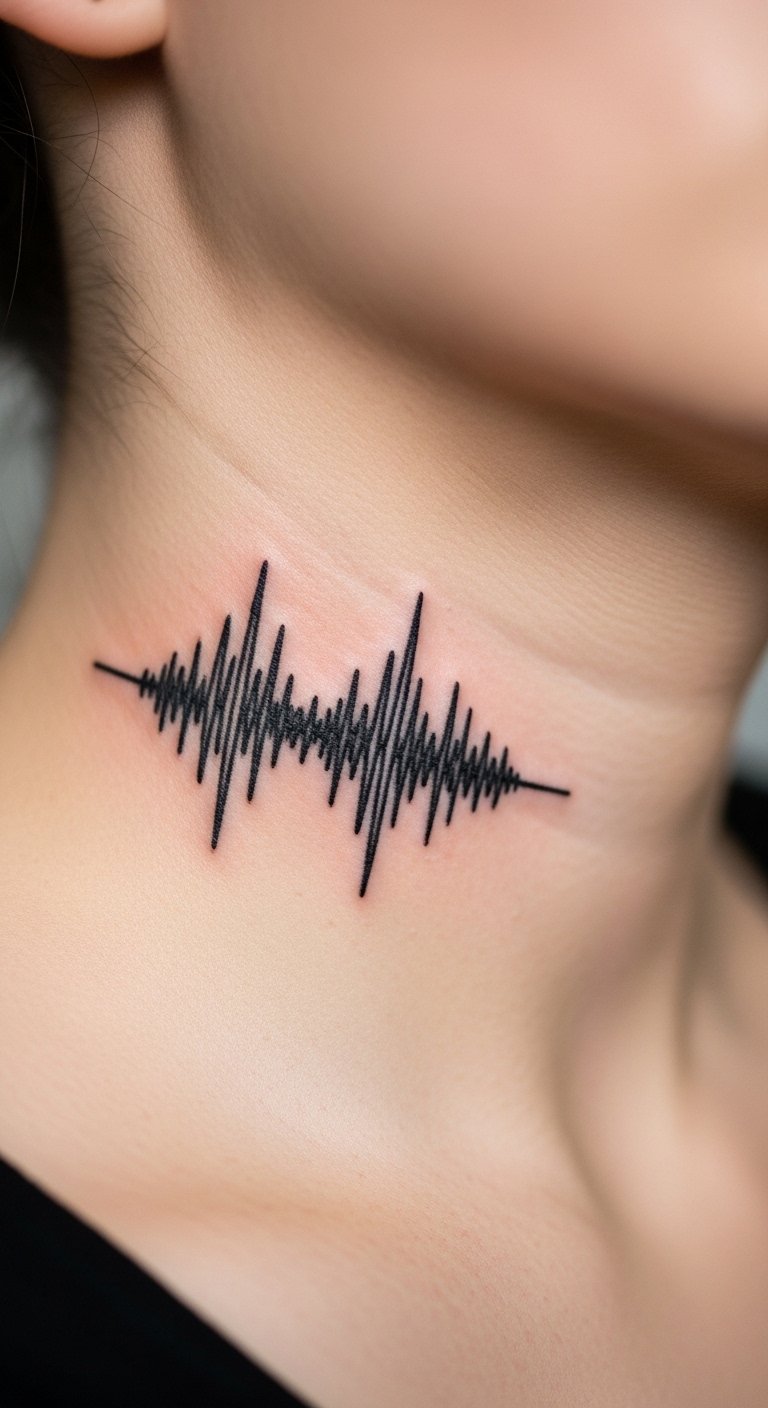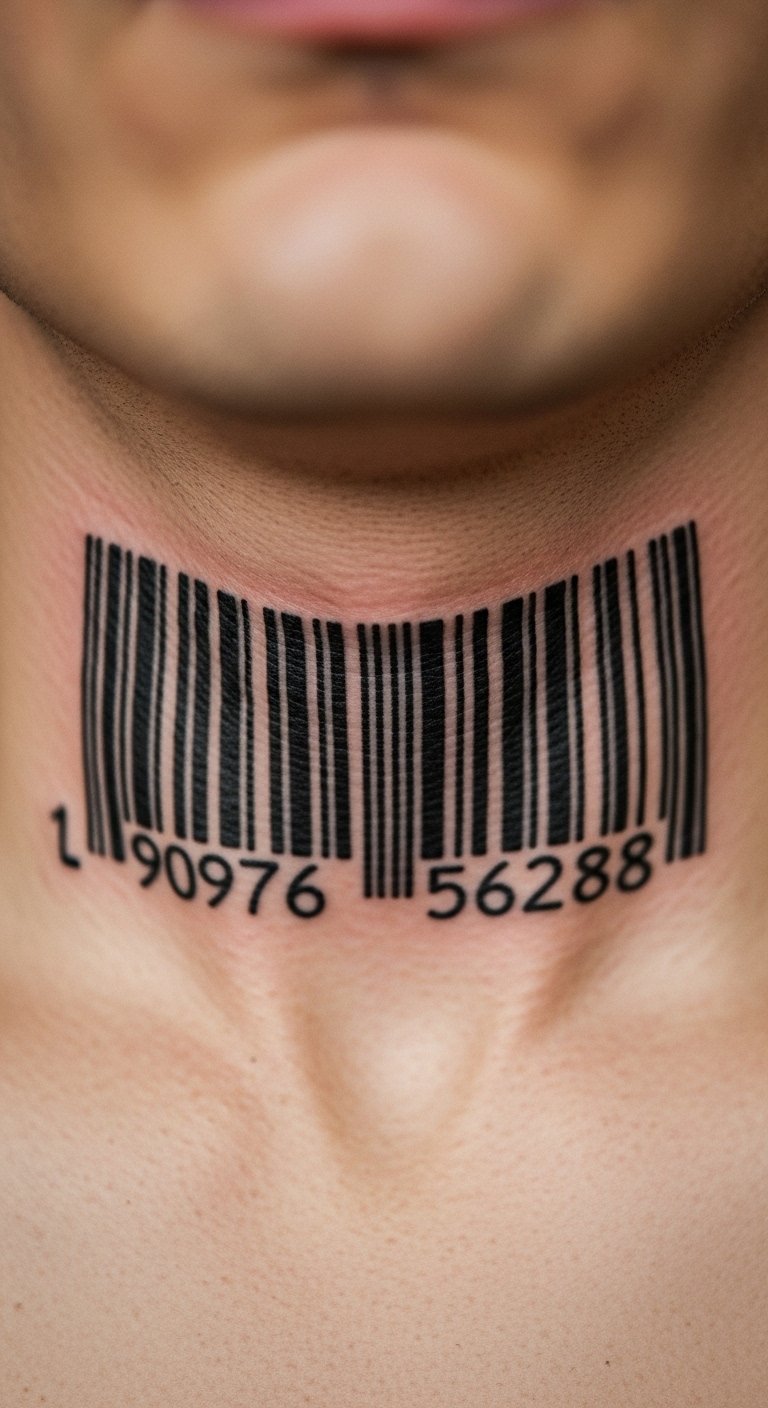 A barcode or numeric strip is graphic and modern. Throat placements carry high pain and require bold, consistent lines. Fine gaps can blur—ask for solid, even lines. Watch how it moves when swallowing; consult on exact placement to avoid distortion.