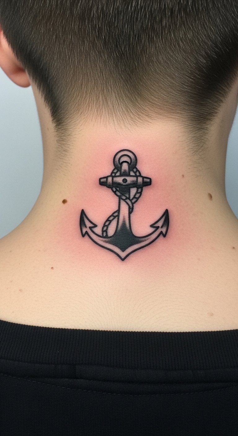 A tiny anchor is classic and ages predictably. Traditional bold lines resist blurring. Nape placement is less painful than throat. Keep the design simple. Ask for saturated black outlines to ensure shape longevity.