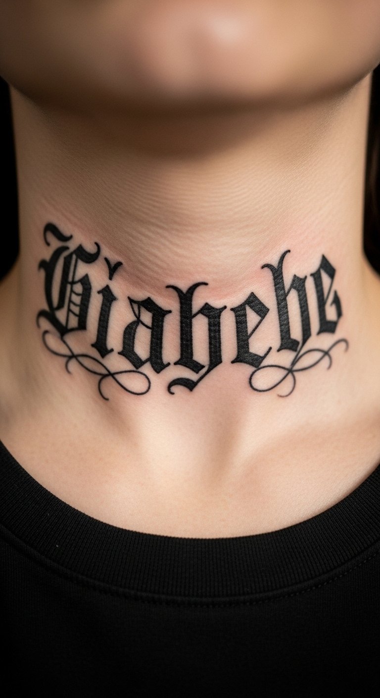 Gothic script looks powerful across the throat. Thin strokes lose clarity—opt for strong blacks. Pain and healing are intense; avoid small decorative flourishes that blur.