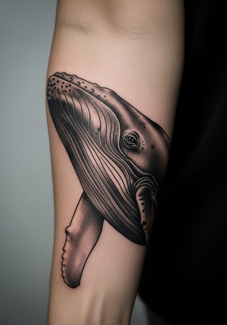 A realistic whale feels quiet and vast. I saw this style pop up when artists leaned into black-and-gray realism for longevity. On the outer forearm the whale reads well in motion and is low-to-moderate in pain. Expect surface healing in 2-3 weeks and full settling by a few months. Blackwork keeps the portrait readable longer than bright watercolor. A common mistake is asking for too-small detail; whales need room to breathe. Ask your artist for healed photos of similar whale portraits and request shading that won’t blob over time. Related terms: realistic whale, marine life, black and gray.