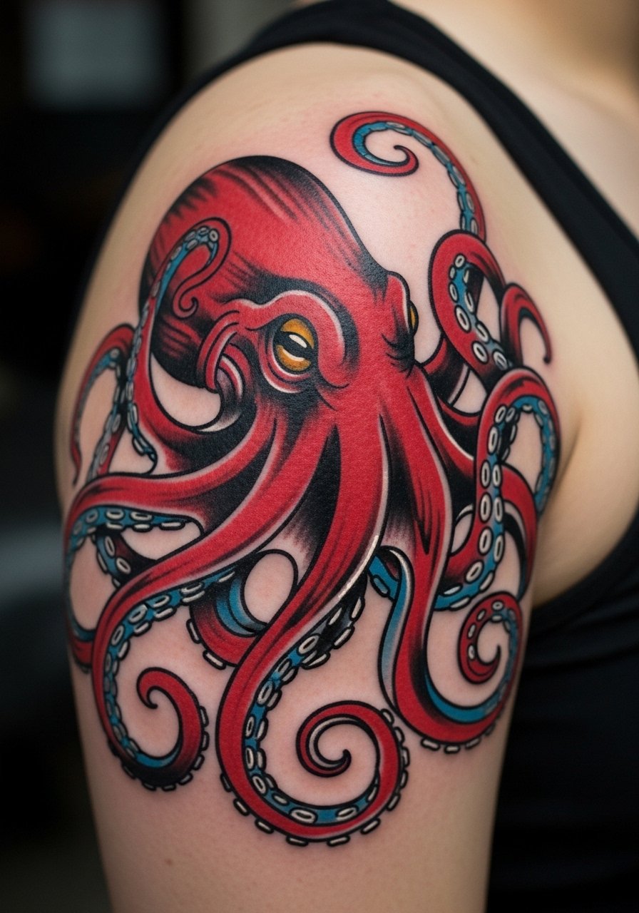 A nautical octopus is a classic for adaptability and mystery. Neo-traditional linework holds up especially well on the shoulder, where skin moves less. Pain is usually mild. This style uses bold outlines and color blocks that age predictably. From what I’ve gathered, avoid tiny tentacle details that turn into a gray mess; keep the suction-cup shapes bold. If you want a sleeve later, design the octopus with negative space in mind. Related terms: bold octopus, nautical, traditional.