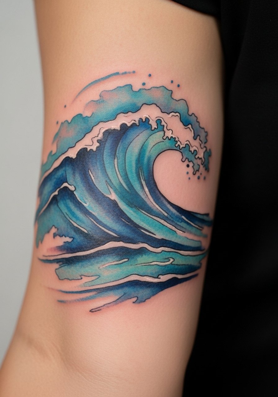 Watercolor ocean waves capture movement and calm. I love this for its beachy vibe, but I’ll warn you: watercolor fades faster than black and gray. Inner arm placement keeps it visible and sheltered from sun. Expect peeling and dulling during healing; daily moisturize and sunscreen later. Artists I follow suggest anchoring watercolor with a fine line wave to preserve form as color fades. Common mistake: asking for extreme splatter effects in tiny sizes—scale matters. Related terms: watercolor sea, ocean waves, small ocean tattoos.