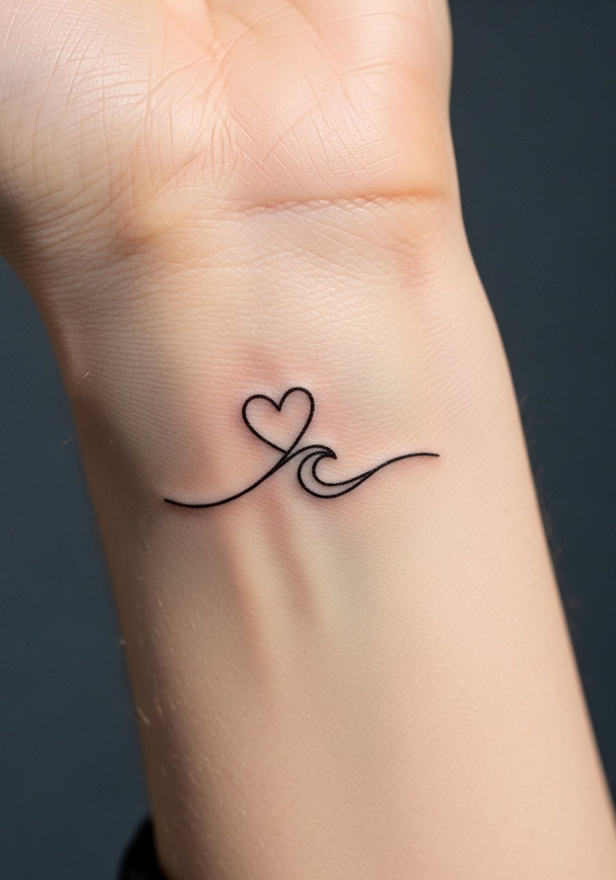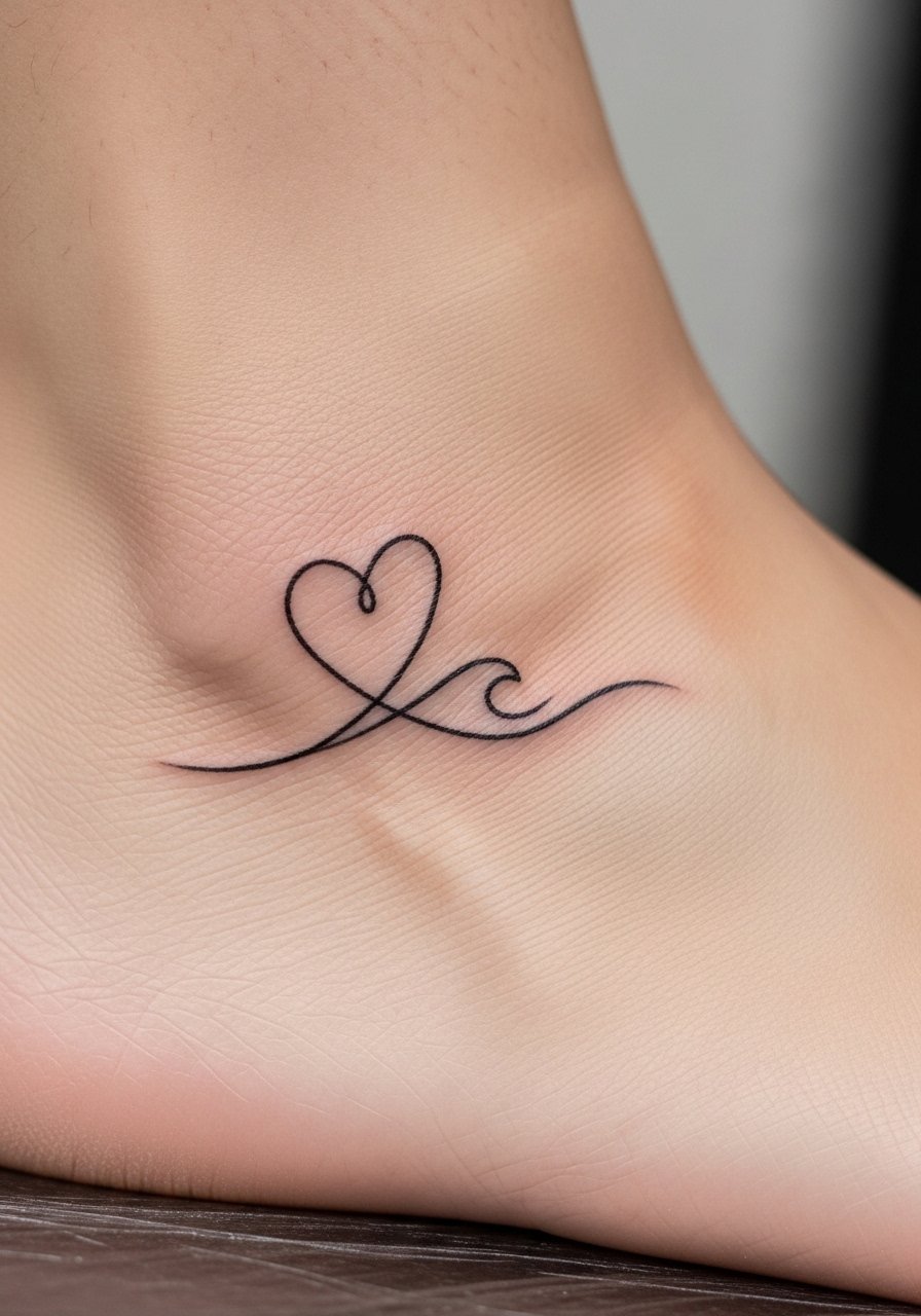 A heart-wave is sweet and symbolic. Ankle placement can sting more than the forearm but heals cleanly with reduced friction if you avoid tight shoes. I recommend slightly thicker linework for small wrist or ankle pieces so the shape stays readable. Related terms: heart waves, small ocean tattoos, minimalist.