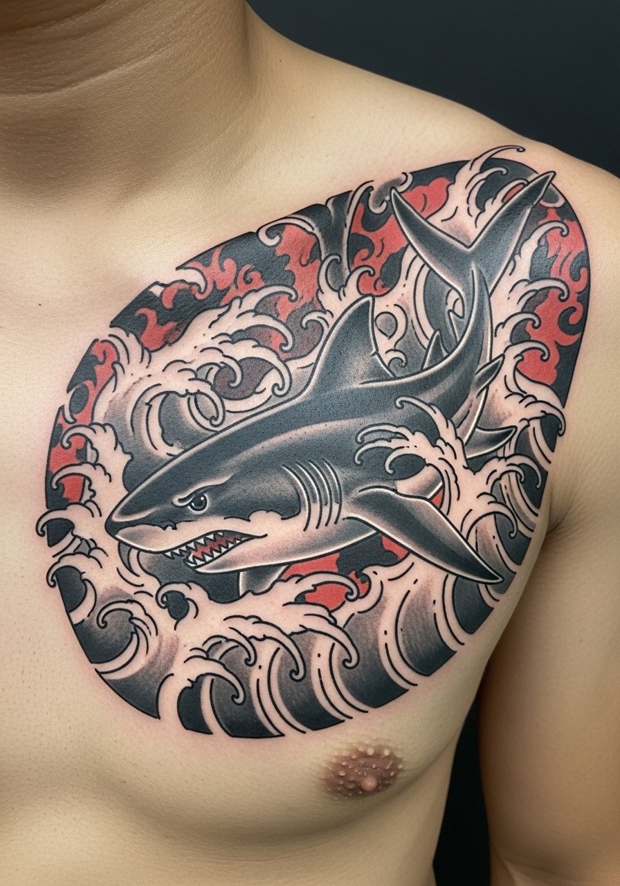 A neo-traditional shark reads as strength and adventure. Chest placement gives a broad canvas. Pain can rise near the sternum and ribs. Color holds differently across skin tones—ask your artist about saturation for your skin. I recommend asking for solid outlines to keep the composition readable as pigments shift. Common mistake: cramming too many elements into a tight chest area; let the shark breathe. Related terms: neo-traditional, shark with waves, marine life.