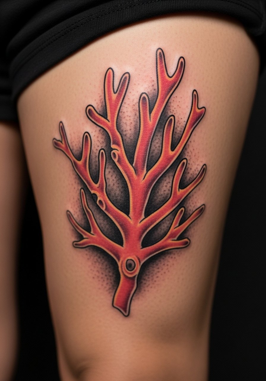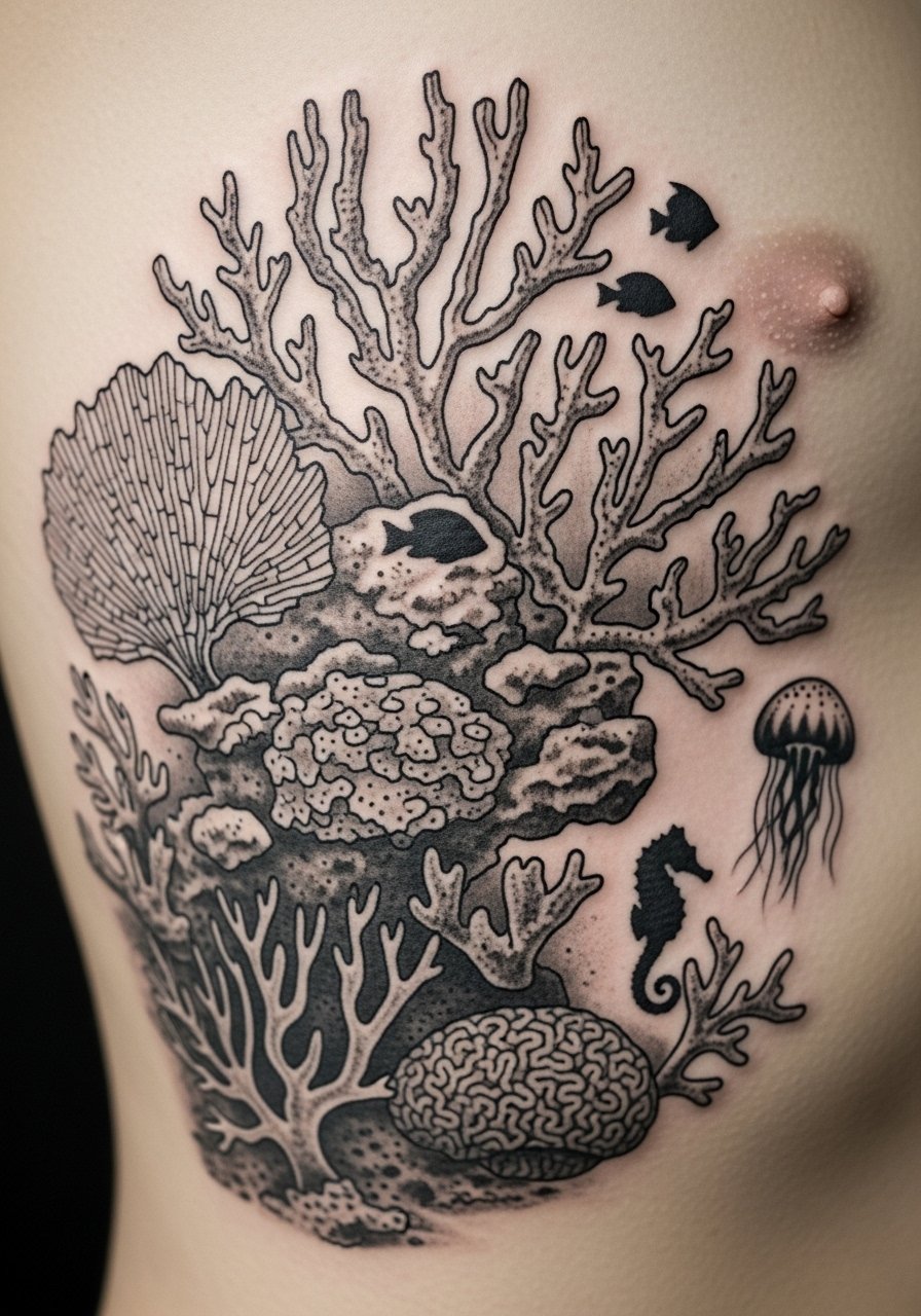 A coral half-sleeve on the thigh is dramatic and allows intricate ecosystems. Thighs are less painful than ribs and hold color well. I recommend black-and-gray base with color accents so the piece remains readable if pigments soften. Avoid tiny polyps; stick to medium forms. Related terms: coral reef scene, marine life, black and gray.