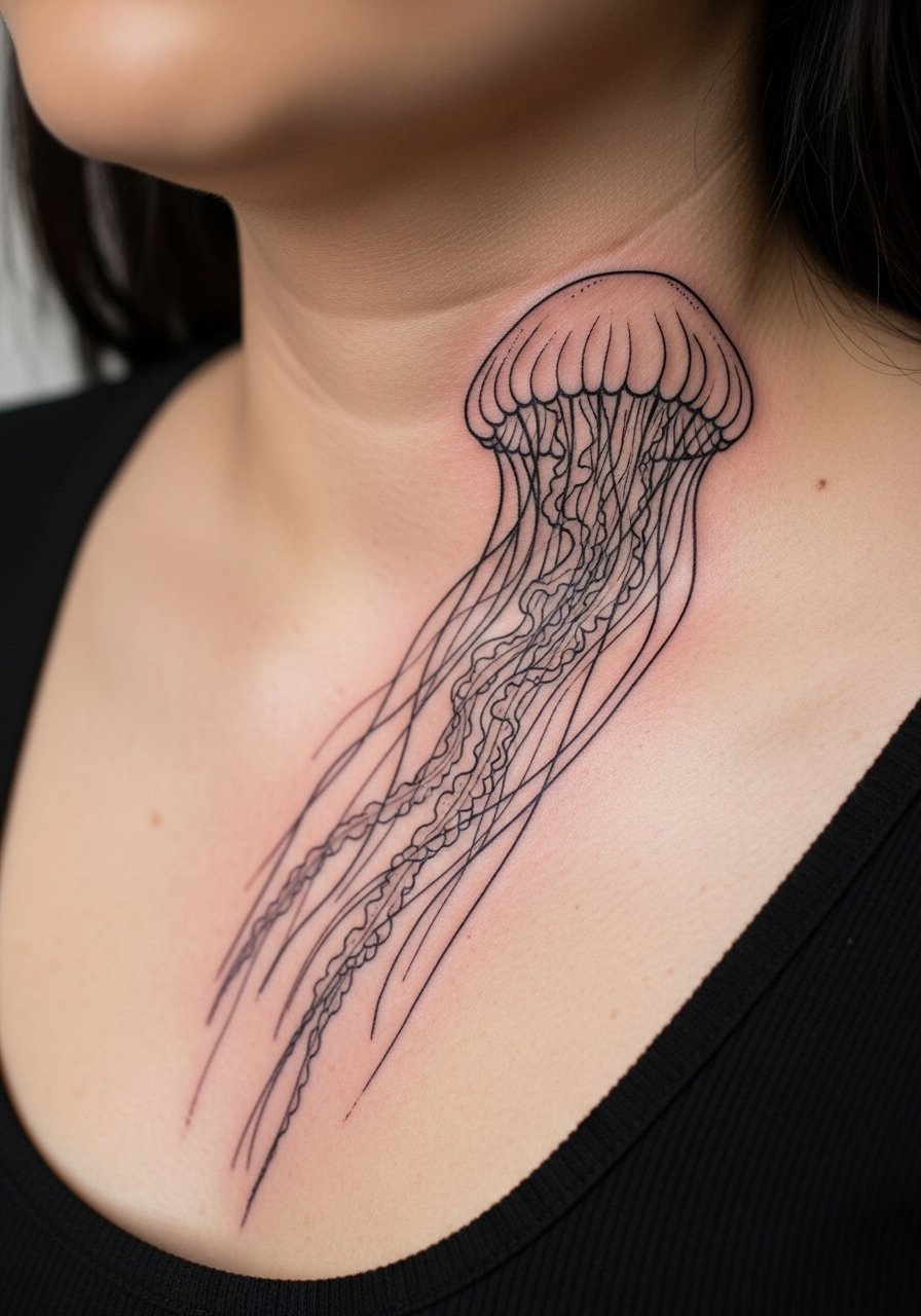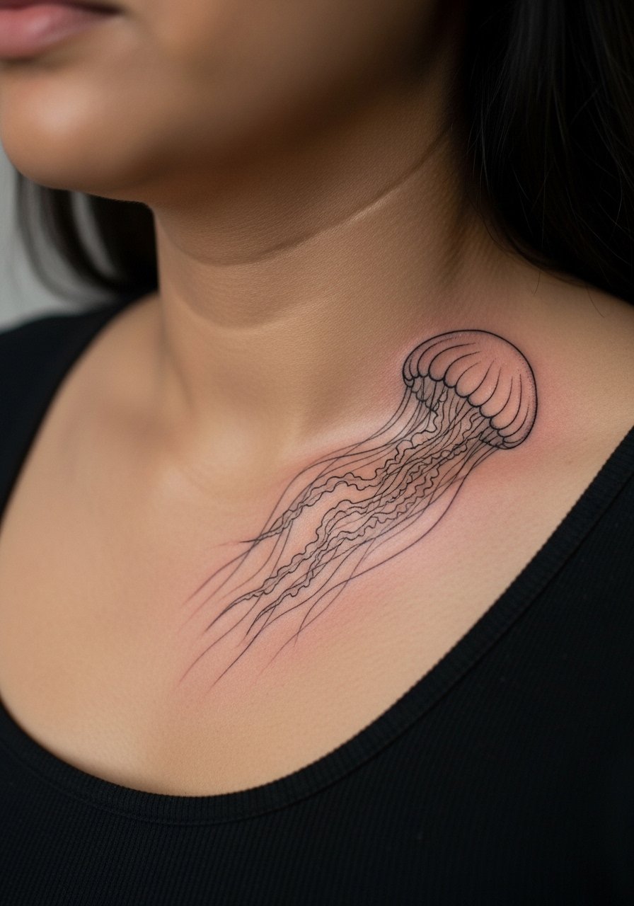 Long tentacle jellyfish across the collarbone are feminine and dynamic. The area can be sensitive, so expect higher pain than the outer arm. Ask artists for healed shots of long linework on collarbones. Keep tentacles slightly thicker than hairline to avoid premature blur. Related terms: fine line jellyfish, collarbone placement, underwater.