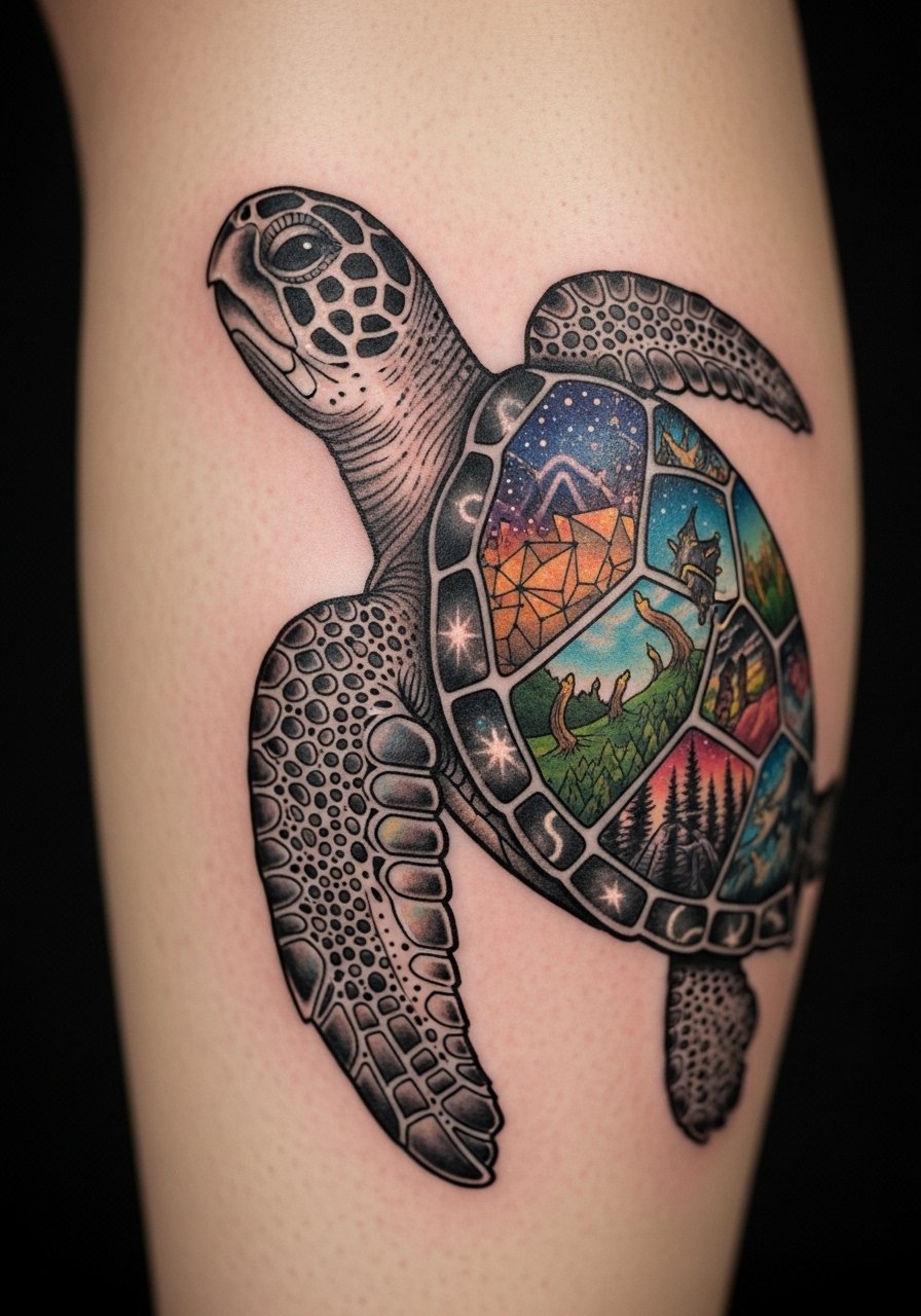A surreal turtle blends protection symbolism with creative motifs. The calf is a forgiving placement with moderate pain. Surreal details let artists play with shells, islands, or maps inside the shell. From what I’ve seen, black and gray helps surreal elements age consistently. Avoid over-detailing in tiny shell sections—scale up if you want intricate patterns. Related terms: ocean turtle, surreal ocean, protection.