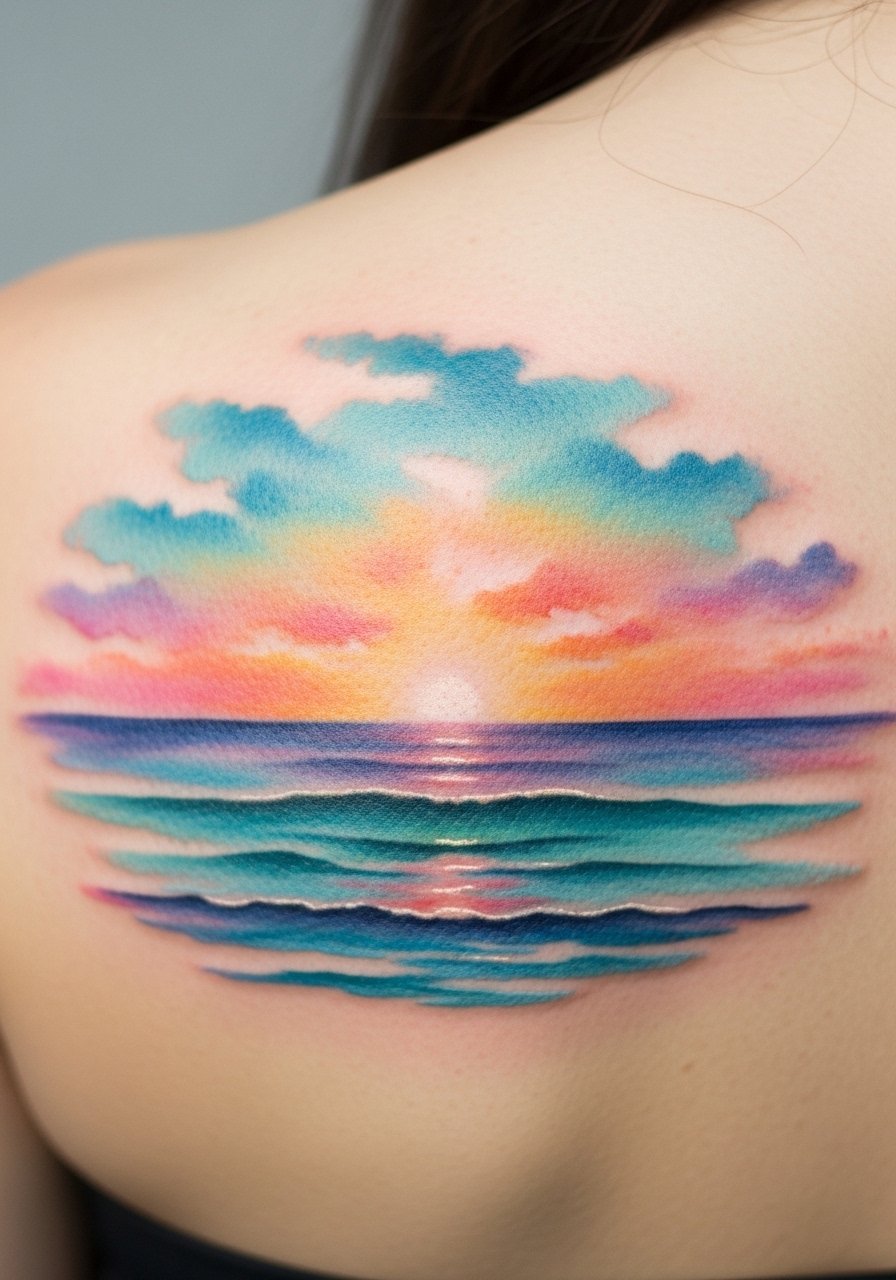 A sunrise over water reads hopeful and calm. Shoulder blade placement hides well under clothing and avoids constant sun exposure if you take care during summer. Watercolor here is beautiful but needs sunscreen long-term. I’ve noticed artists often combine a faint line horizon to prevent the design from dissolving as colors fade. Common mistake: insisting on tiny watercolor suns—scale keeps the blending readable. Related terms: ocean sunrise watercolor, watercolor sea, shoulder blade tattoo.