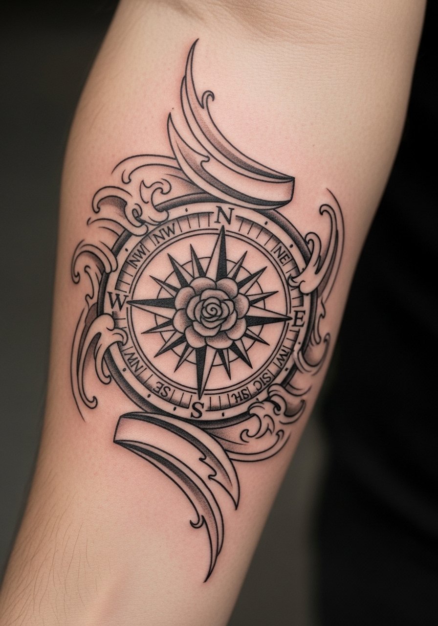 A compass with waves is a timeless navigation symbol. Forearm placement gives daily visibility and low pain. I advocate for clean linework; small, fuzzy compasses lose their purpose. Ask your artist to emphasize contrast so the needle and waves remain distinct as the ink shifts. Related terms: nautical compass, waves, timeless.