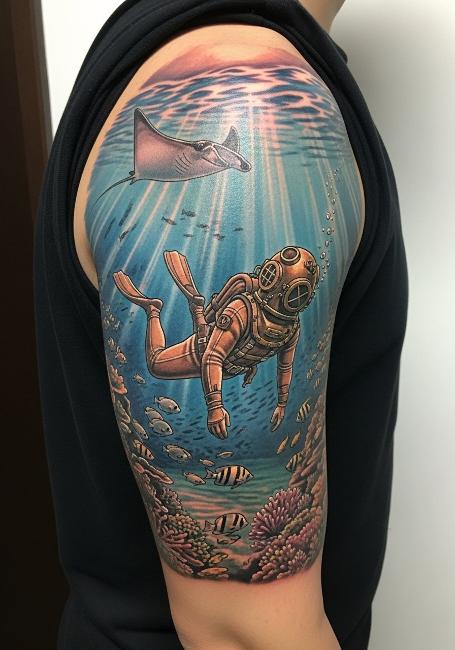 A diver scene builds a story across your arm. This is a commitment and needs an artist skilled in realism. I’ve seen these age beautifully when black and gray shading is used. Pain varies—near elbow and inner arm can be sharper. Avoid too many tiny figures; a few well-composed elements read better. Related terms: realistic diver, underwater, sleeve.