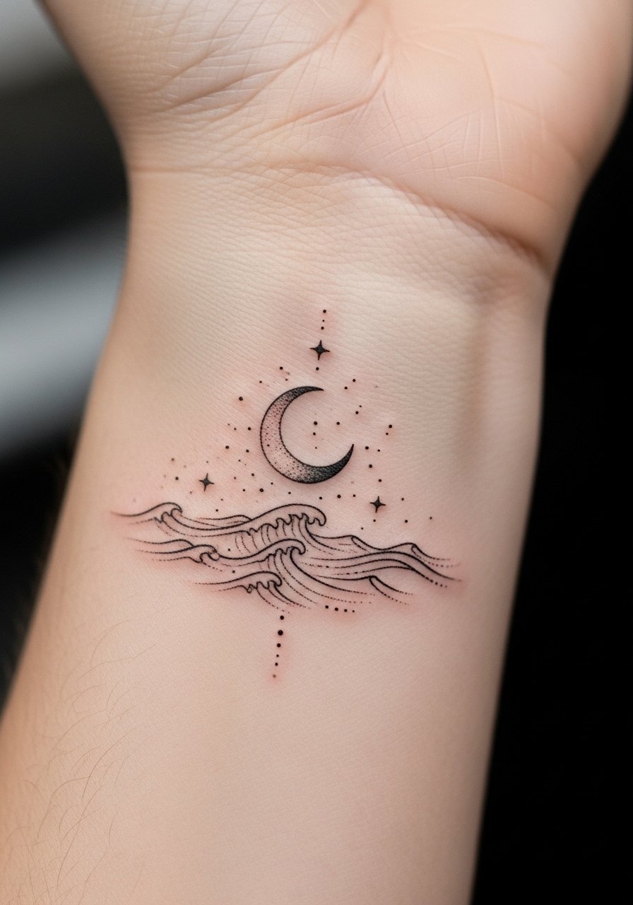 This design is poetic and subtle. Inner wrist placement is personal and low pain but visible. Minimalist moon reflections can blur if lines are too thin; request slightly bolder lines for durability. I often tell newbies to try temporary versions first. Related terms: minimalist ocean, moon reflection, first ocean tattoo ideas.