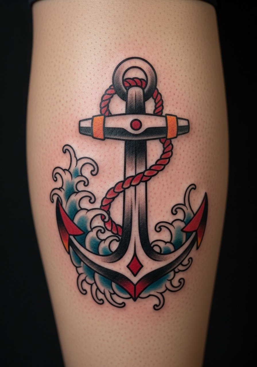Anchors are classic symbols of stability. The calf is forgiving and keeps the anchor visible when you want it to be. Traditional styles’ bold outlines make them low-maintenance. From what I’ve seen, the biggest mistake is asking for ornate tiny anchors—keep proportions solid. Related terms: anchor with ocean foam, nautical, traditional.