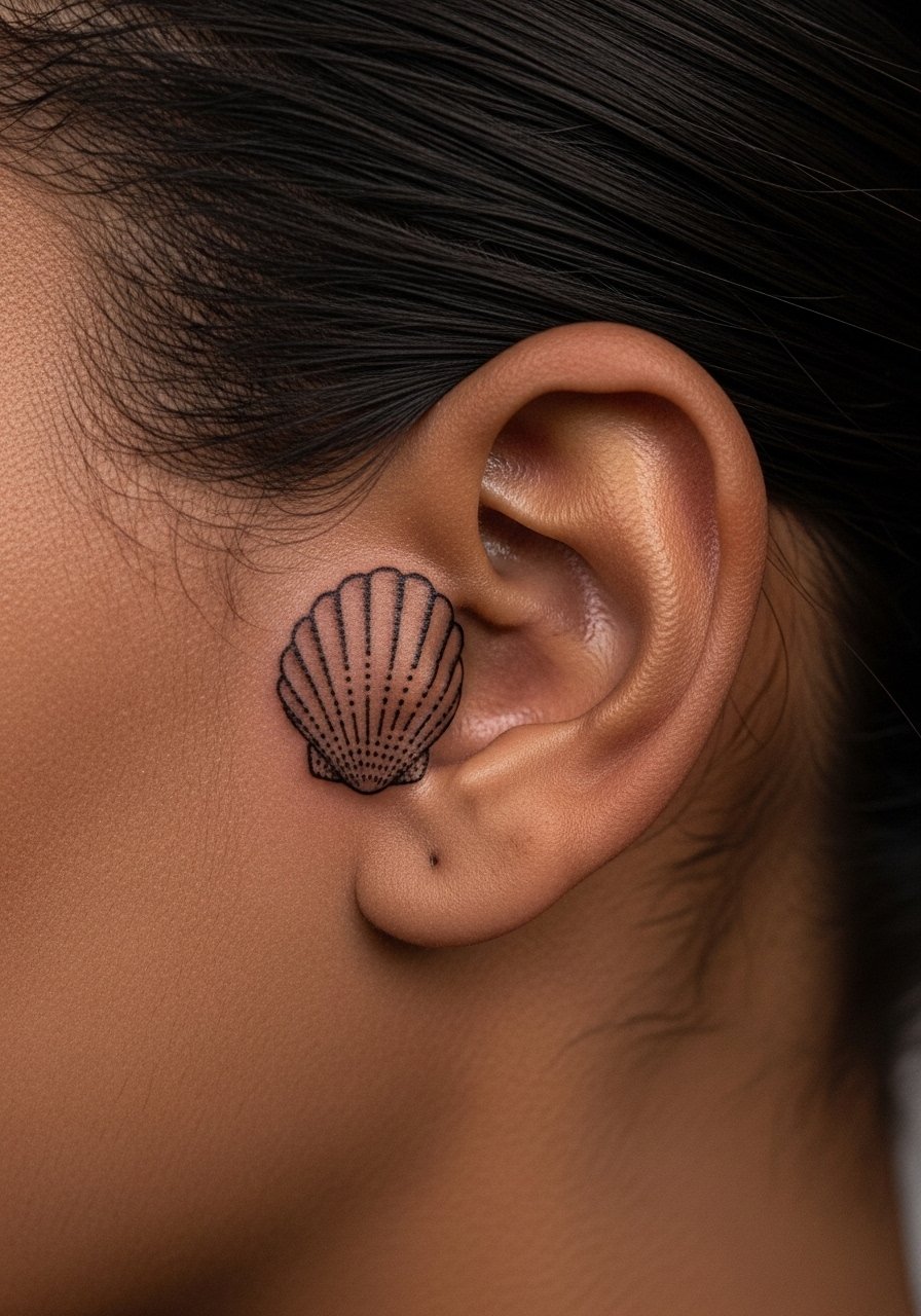 Handpoke shells offer an organic look. Behind the ear is discreet. Handpoke work ages differently; imperfections are part of the charm but choose an artist experienced with handpoke. Common mistake: using handpoke for complex shading—keep it simple. Related terms: tiny shell, handpoke minimalist, first ocean tattoo ideas.