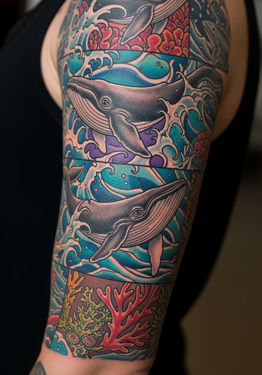 Patchwork sleeves let you mix creatures and motifs without a single cohesive scene. I like this if you want variety—add whales, octopus, reefs, and compass pieces over time. Make sure each patch has breathing room so the sleeve doesn’t read cluttered as it ages. Ask your artist about contrast and negative space planning. Related terms: patchwork ocean, marine life, sleeve.