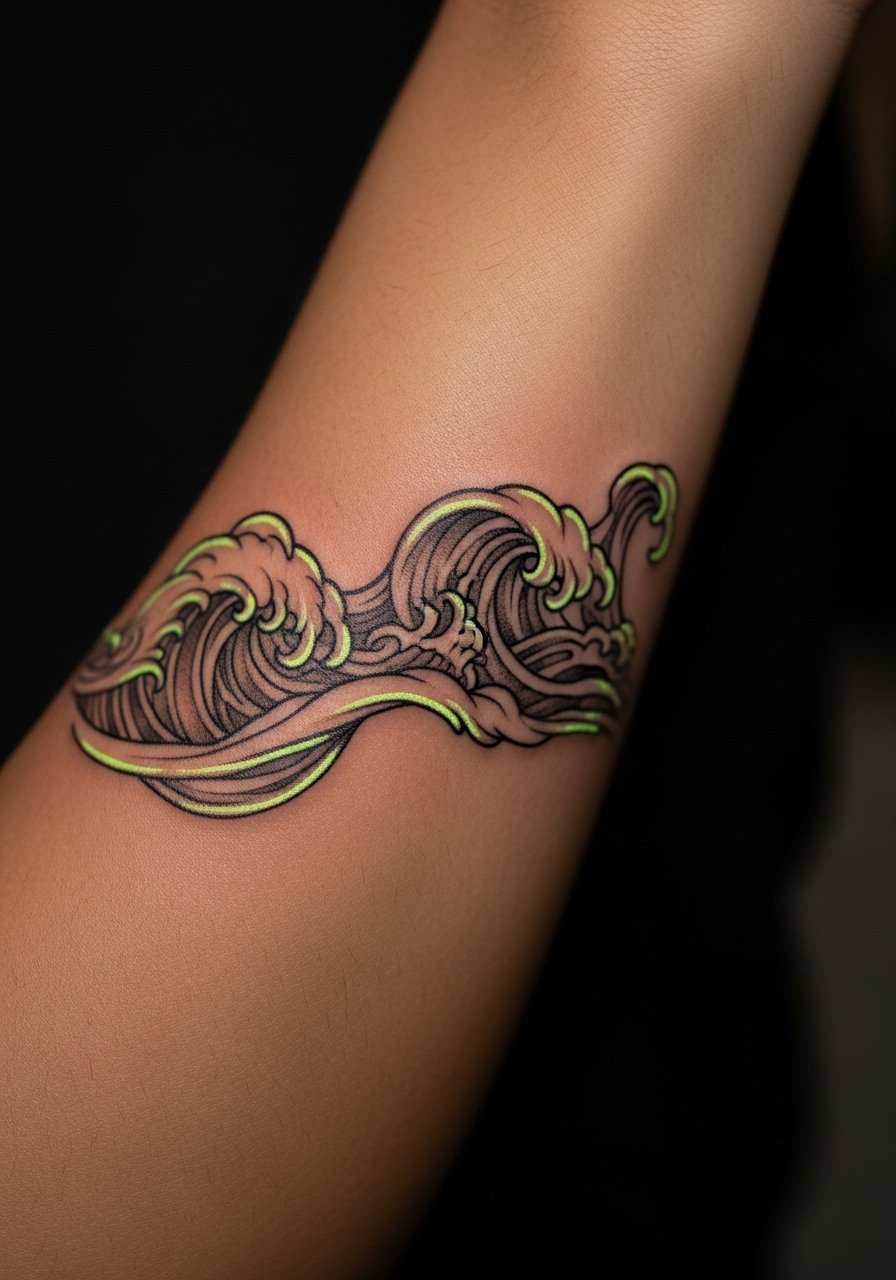 17. UV-Reactive Ocean Waves on Forearm (Subtle Glow)