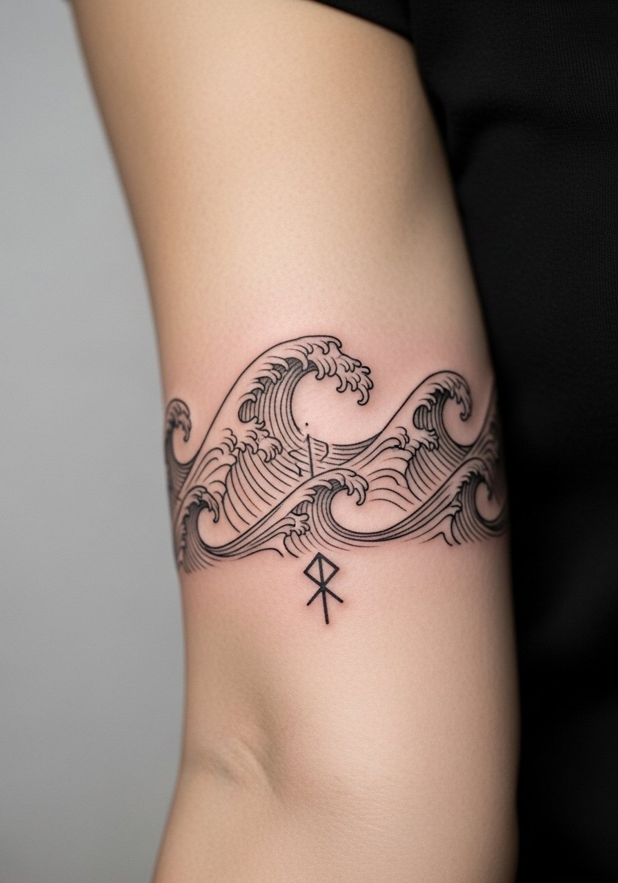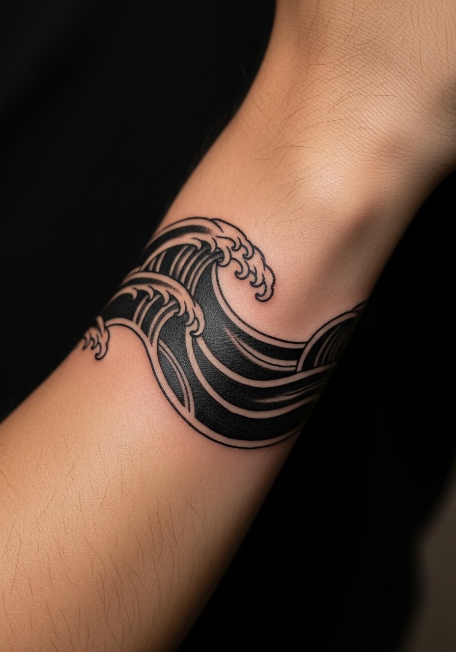 A blackwork wave band reads graphic and timeless. Thick black areas hold up well across skin tones. Forearm placement is visible and lower pain. Avoid tiny negative shapes inside thick fills—keep the pattern readable. From my experience, blackwork is the go-to when you want low-maintenance vibrancy. Related terms: blackwork, wave band, minimalist ocean.