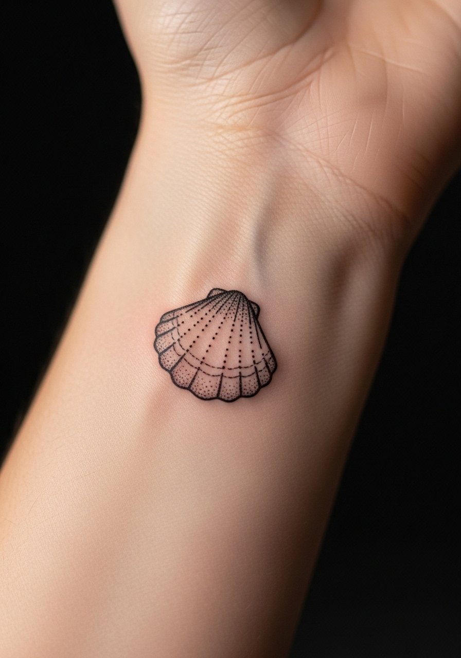 Handpoke shells are low-key and intimate. The wrist sees movement, so keep the shell simple. I’ve noticed handpoke textures age into a soft, almost pointillist look—some people love that. Ensure pigments used are safe for handpoke techniques. Related terms: handpoke shell, tiny shell, first ocean tattoo ideas.