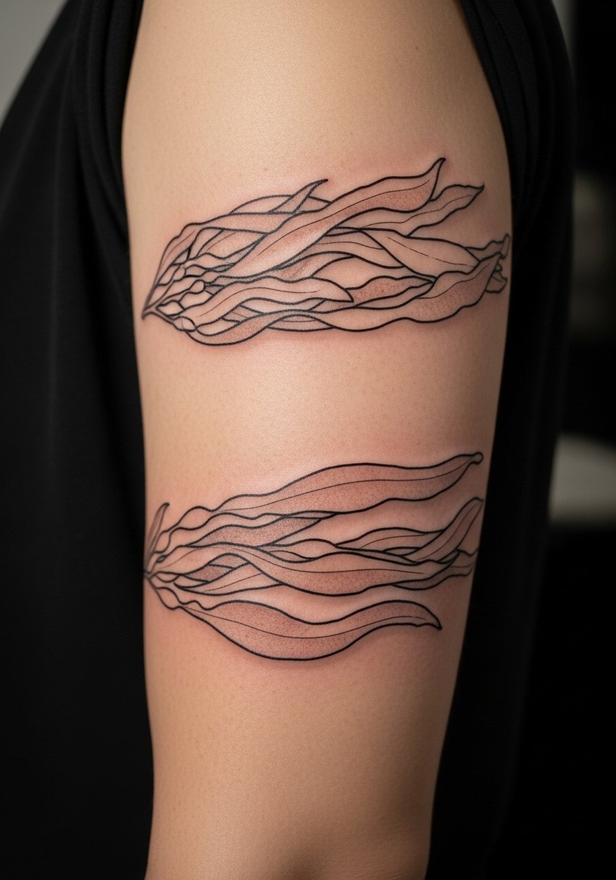 A kelp band is subtle and wearable. Upper arm placement keeps it low pain and easy to hide. Fine line works well here but needs a skilled hand for even spacing. I recommend a slightly stronger anchor line so the pattern keeps its rhythm as it ages. Related terms: kelp band, minimalist ocean, forearm placement.