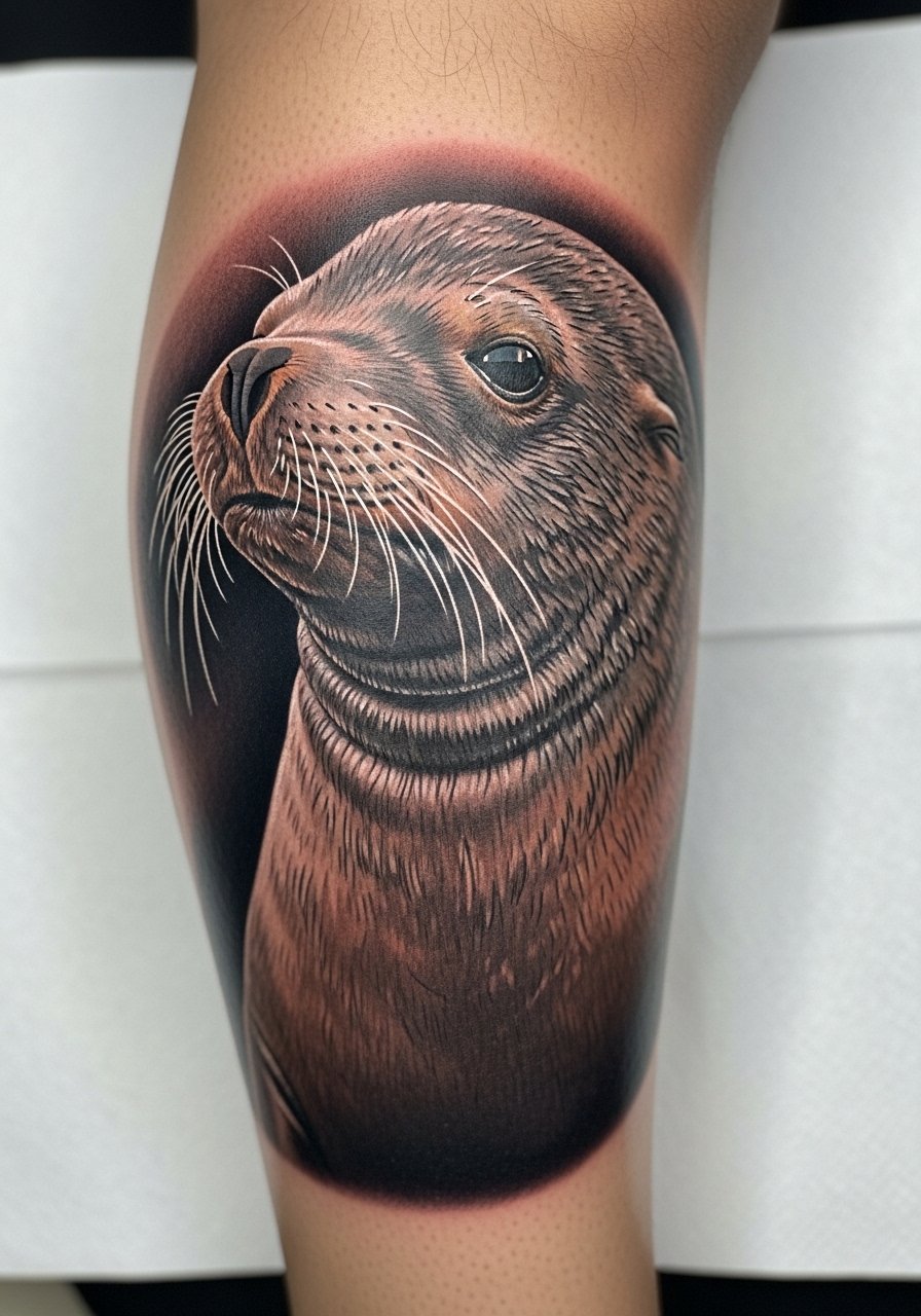 Sea lion portraits are expressive and a little playful. Calf placement gives space for facial detail. I often tell clients to pick subjects with clear contrasts—seals and sea lions work well in black and gray. Common mistake: cramming background reef details that steal focus. Ask to see healed-real examples of animal portrait work. Related terms: marine life, realistic portrait, black and gray.