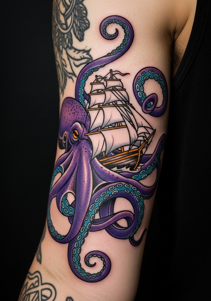This motif mixes classic sailor imagery with bold neo-traditional color. The bicep is forgiving and low pain. I like the visual drama of tentacles interacting with a ship silhouette. Make sure the ship’s silhouette remains simple so the octopus reads clearly from a distance. Related terms: bold octopus, nautical, neo-traditional.