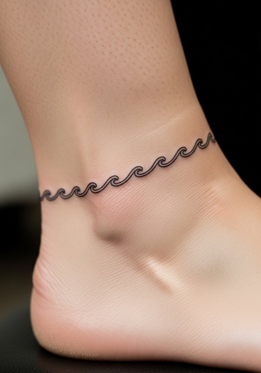 An ankle wave band is subtle and rhythmic. Be aware the ankle can be more painful than forearm due to thin skin. Keep lines bold enough to resist blurring. I advise a touch of negative space between repeats so the pattern stays crisp. Related terms: wave band, minimalist ocean, small ocean tattoos.