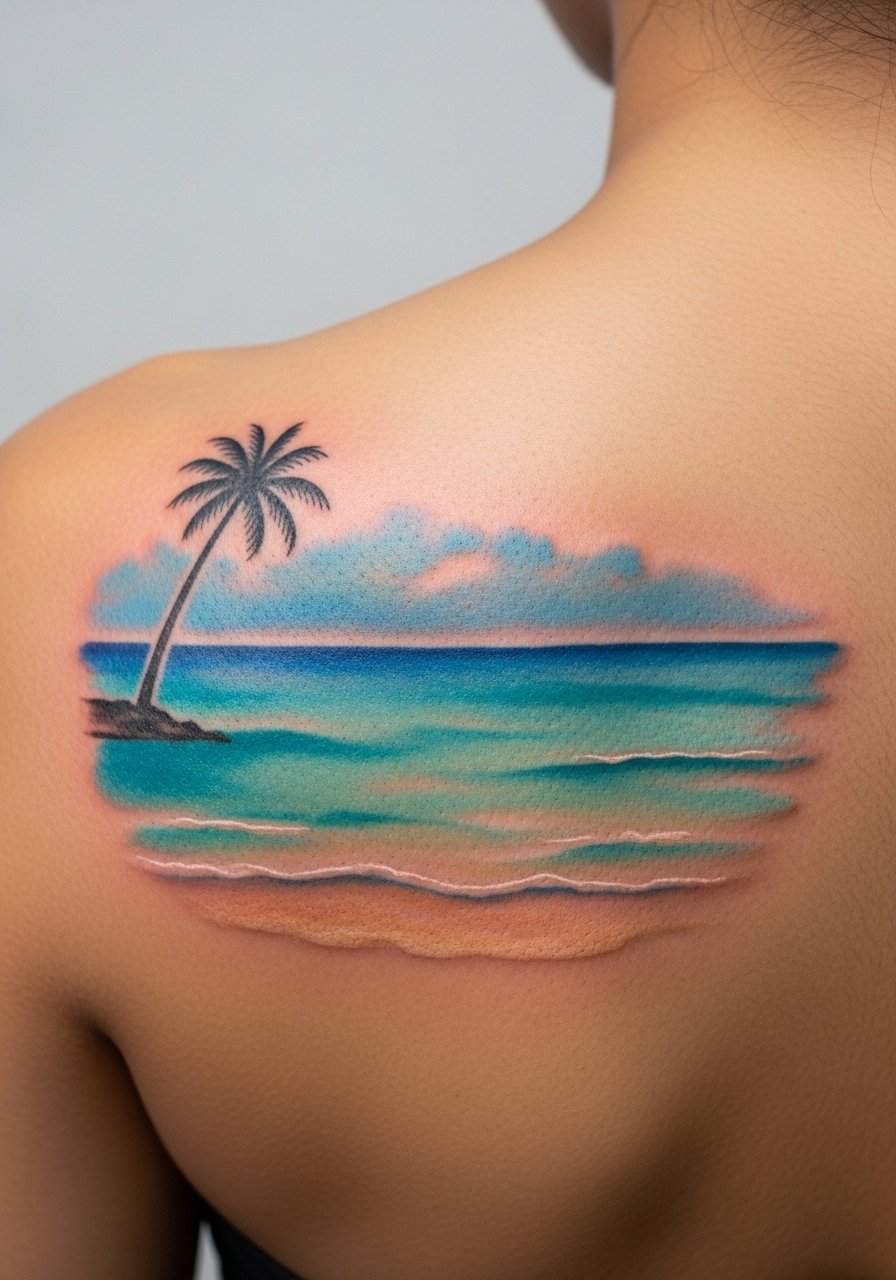 A watercolor beach scene reads like a postcard. Shoulder blade placement is forgiving and good for larger watercolor washes. I often see people pair this with a fine-line horizon for structure. The trick is to accept some color softening over time and plan for touch-ups if you want vivid saturation. Related terms: watercolor sea, ocean sunrise, shoulder blade tattoo.