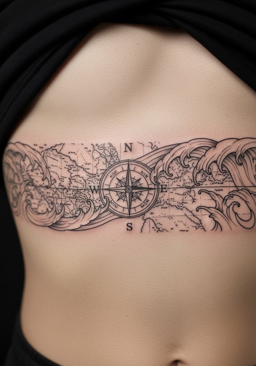 Ribcage maps look epic but hurt. I only recommend this if you’re prepared for sensitivity. Fine-line cartography reads well if given space; the ribs challenge both artist and client. From what I’ve learned, ask for slightly bolder linework for this area to avoid loss of detail. Related terms: nautical map, compass with waves, ribcage placement.