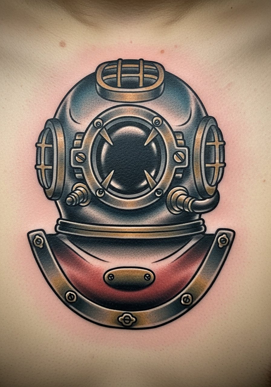 A retro diver helmet is nostalgic and cinematic. Center chest placement can be more painful near the sternum. I like the helmet for storytelling—add tiny ocean creatures inside the glass. Ask your artist about healed examples for chest detail. Keep key elements bold so they remain clear as the skin ages. Related terms: diver helmet, marine life, neo-traditional.