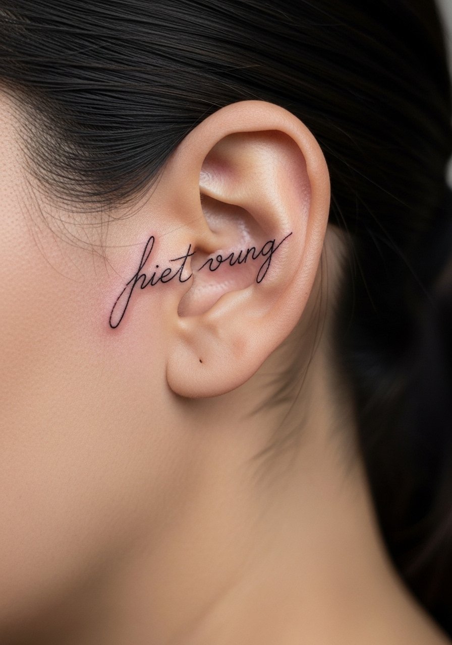 I got hooked on subtle illusions like a floating word that uses gaps to appear suspended. Fine line behind the ear reads intimate and unexpected when you tuck hair. Pain is mild; the skin is thin but quick to tattoo. Healing takes about 2–3 weeks for surface skin, and the lines can blur slightly over a year—so ask your artist for slightly bolder line weight if you want longevity. The visual feels secret and meaningful. Avoid overly tiny lettering; the common mistake is making lines too thin to survive healing. Look for artists who specialize in fine line and negative space. Ask to see healed examples on similar skin tones so you know how the script will settle.