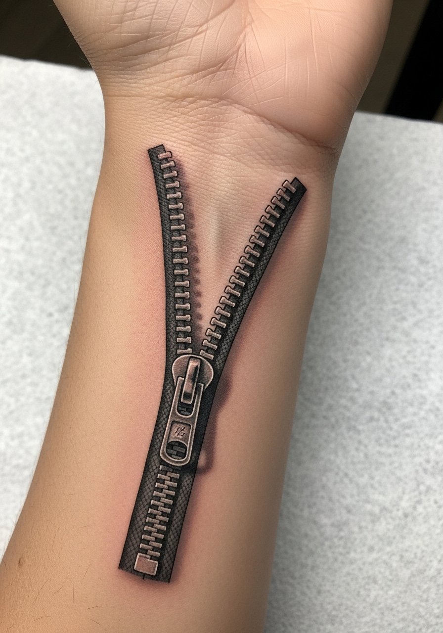 A zipper tattoo blends micro-shading and edge highlights to look like clothing unzipped to reveal skin or imagery underneath. On the inner wrist it constantly surprises. Pain sits in the medium range because the area is bony and has thin skin. Healing shows scabbing around the darkest shadows—don't pick. Over time, tiny highlights can fade, so ask your artist about touch-up plans. Typical mistake: flat shading without layered gradients; that kills the 3D effect when healed. Look for artists who do trompe-l'œil and realistic texture work.