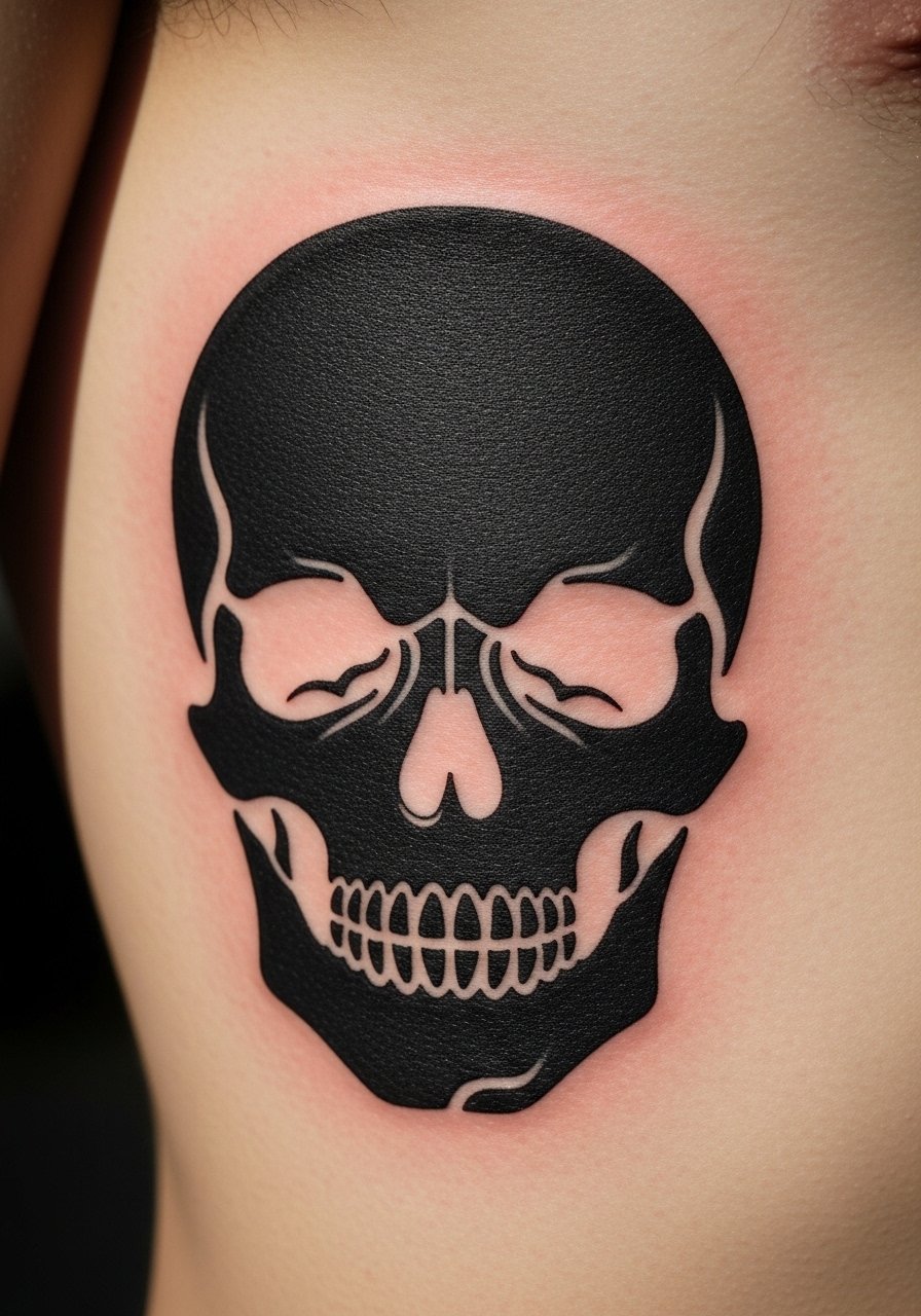 Using blocks of solid black and carved-out skin gives an image that resolves at a distance. Ribs hurt more than other spots, but the placement hides well under clothing. Healed blackwork often keeps shape longer than thin linework, but you may see slight softening at edges—skin shifts matter. Common mistake: letting the negative space be too skinny; it can fill in. Ask for bold negative-space shapes and healed photos to be sure the skull reads after healing.