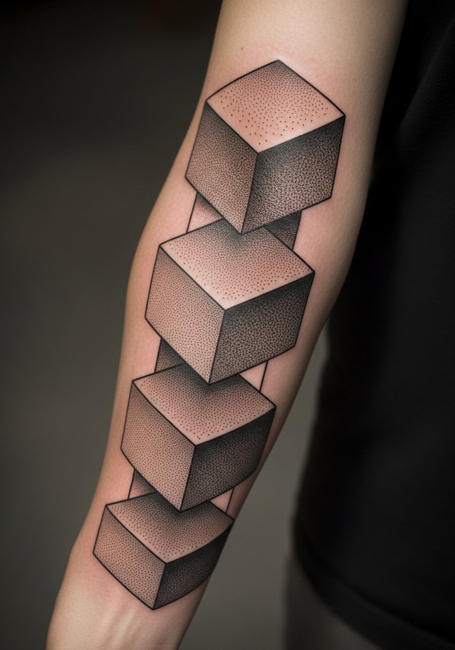 A sleeve of stacked cubes creates an Escher-like depth. Dotwork shading softens transitions and helps the 3D illusion last healed. Outer arm placement is moderate pain and holds detail well. Because sleeves are larger, they heal over multiple sessions and may need touch-ups to unify tones. Avoid overcomplicating the negative space; too many tiny cubes blur with time. Artists who do precise geometric and dotwork are perfect—ask for sleeves they’ve healed for at least a year.