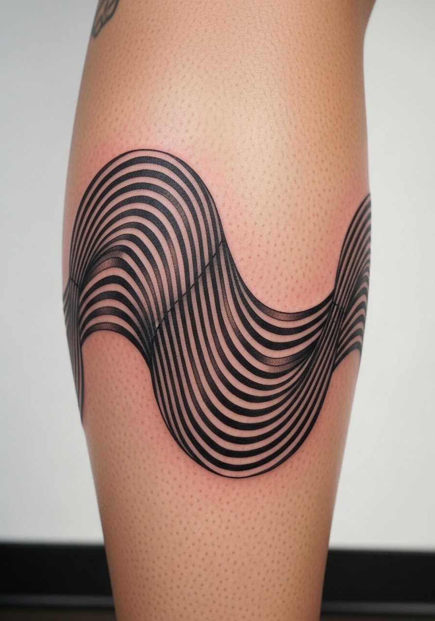 Bands that ripple create motion as you walk. Calf placement is forgiving and relatively low pain, and tattoos here tend to hold shape. Healed lines may soften slightly; choosing solid black with clean spacing prevents bleeding together. A common mistake is packing lines too close—healed skin can blur them. Look for blackwork artists experienced with op art and repetition.