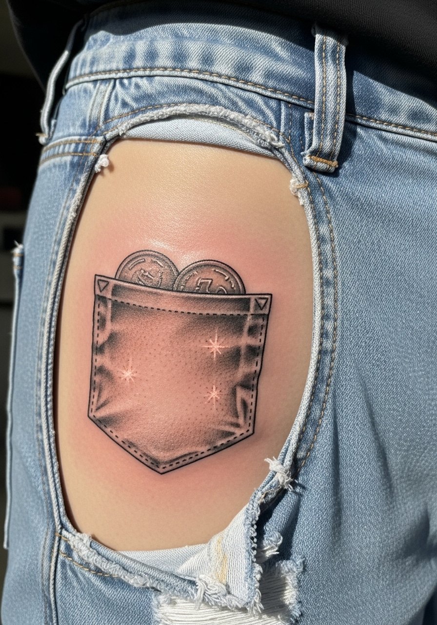 A hip pocket that looks sewn-on uses edge highlights and inner shadows to sit above the skin visually. The hip can be painful, and movement during sessions can be an issue. I’ve seen these hold well if shading is layered. Mistake: too little contrast—then the pocket reads flat. Ask for texture reference work and healed images of similar placements.