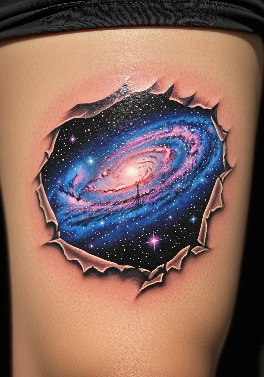Torn-skin illusions that reveal a galaxy combine crisp edges with color gradients. Thigh flesh tolerates long sessions and allows saturation to heal nicely. Colors often look muted while healing and then pop after months—I've seen purples and blues settle differently by skin tone. Common error: overly sharp white highlights that disappear; request subtle whites and layered color. Work with artists who do color realism and healed color portfolios.