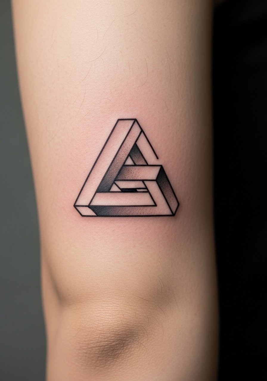 An impossible triangle on a joint reads perfectly when positioned with crease lines. The inner elbow is painful and tricky to heal—frequent bending can cause scabbing. Expect longer surface healing. The trick is to balance line thickness so the illusion survives movement. The common mistake is placing it off-axis; consult with your artist on exact placement relative to motion lines.