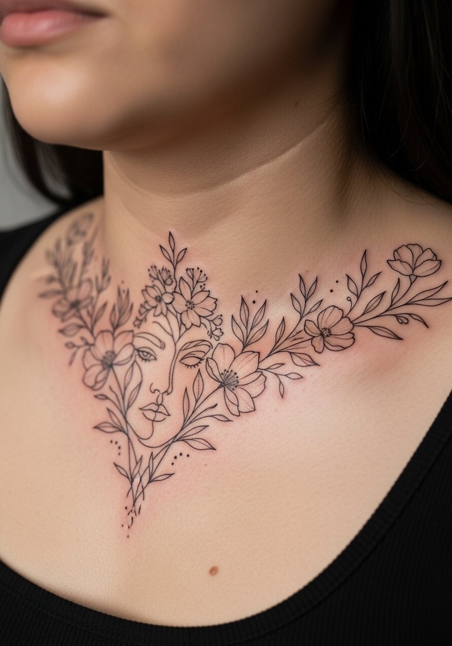 Flowers that hide a face in negative space reward close inspection. The collarbone area has moderate pain and shows movement. Fine line works well but can blur, so artists sometimes thicken key outlines. Healed, the face should still read if negative spaces are broad enough. Newcomers often request too-fine detail—avoid that. Seek artists who blend botanical fine line with optical negative-space composition.