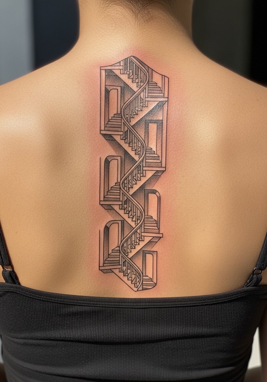 A spine is a natural focal line for impossible structures. Pain is higher on the spine, and sessions are long. Healed blackwork retains structure better than thin lines. The visual reads best from a distance; detail blurs if too intricate. Common error: packing tiny architecture into a small area—scale matters for longevity. Seek artists who specialize in architectural blackwork and healed portfolio images.