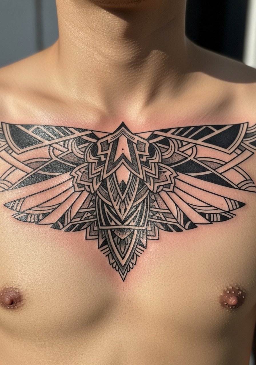 Mirrored designs on the chest use symmetry to trick the eye into depth where none exists. Expect medium pain and longer sessions. Healed symmetry can drift if lines aren’t perfectly executed—alignment is critical. Artists adept at precise blackwork and healed geometric pieces are best. Avoid tiny mirrored details that heal inconsistently.