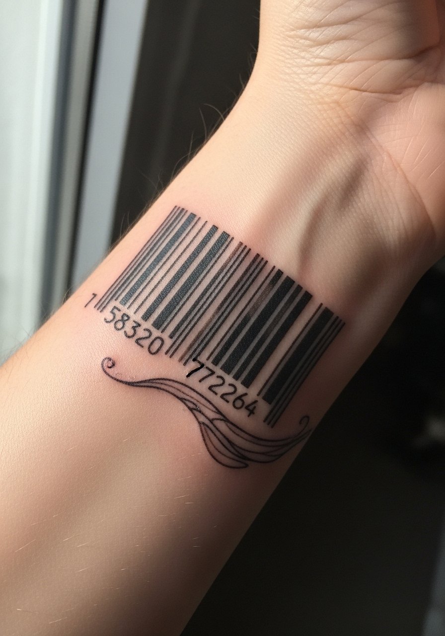 A barcode that warps visually is a simple but effective optical trick. It’s low pain and quick to do. Lines must be spaced carefully since thin bars can bleed. Healed, make sure the artist intentionally thickens lines if needed. This design reads conceptual and modern. Avoid ultra-thin bars that disappear.