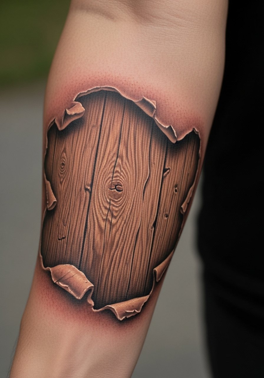 Peeling-skin tattoos are dramatic and use textured shading to sell depth. Forearms tolerate long sessions and show detail well. Healed, textures soften, so artists layer strokes for lasting grain. The biggest mistake is over-etching white highlights that don't last; subtlety wins. Look for artists with hyperreal healed photos.