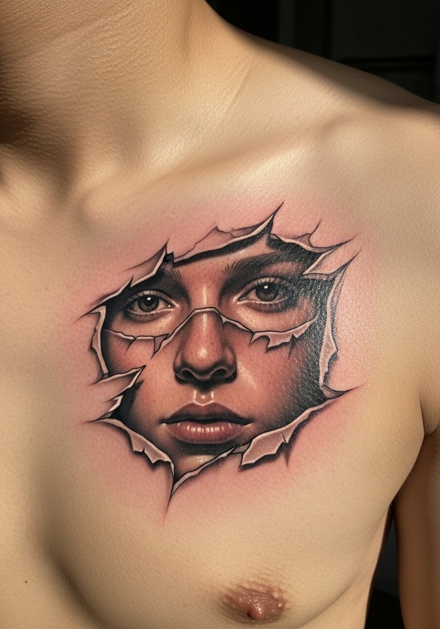 A cutaway portrait combines realism with trompe-l'œil edges. Pain and session time depend on placement. Since portraits need subtle midtones, maintenance is key—healed contrast can mellow. Avoid over-highlighting; ask to see portraits healed at least a year. Choose a portraitist experienced with layered composition.