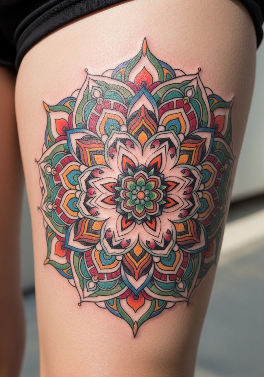 A kaleidoscope panel creates depth through repetitive color and shape. Thighs are excellent for saturation and long sessions. Colors shift during healing; purples and blues often look more muted before fully settled. The common mistake is overcrowding details—give shapes room to breathe to keep the optical effect crisp. Seek colorists with healed leg portfolios.