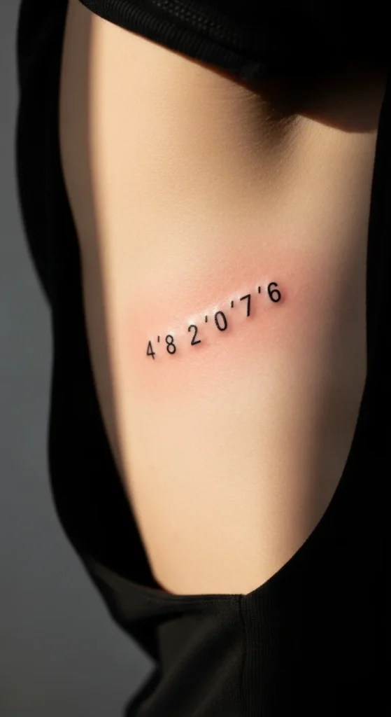 Coordinate tattoos are personal without being obvious. They can represent a hometown, a proposal spot, a travel memory, or a place that changed you. On ribs, it feels like a private map.