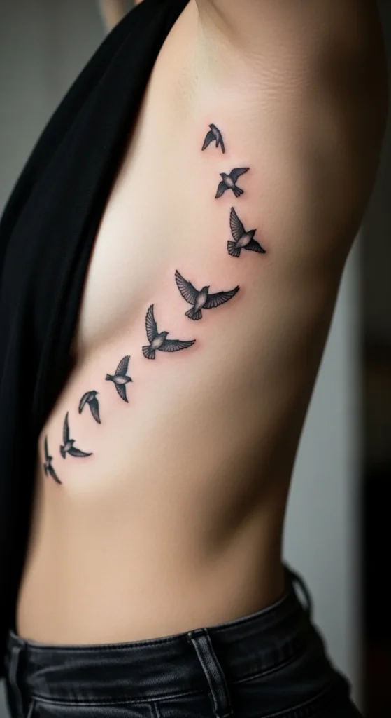 Birds in flight are a classic rib idea because the placement already suggests movement. Three to seven birds usually looks balanced. Start larger near the lower ribs and get smaller as they “fly” upward. That creates a natural flow.