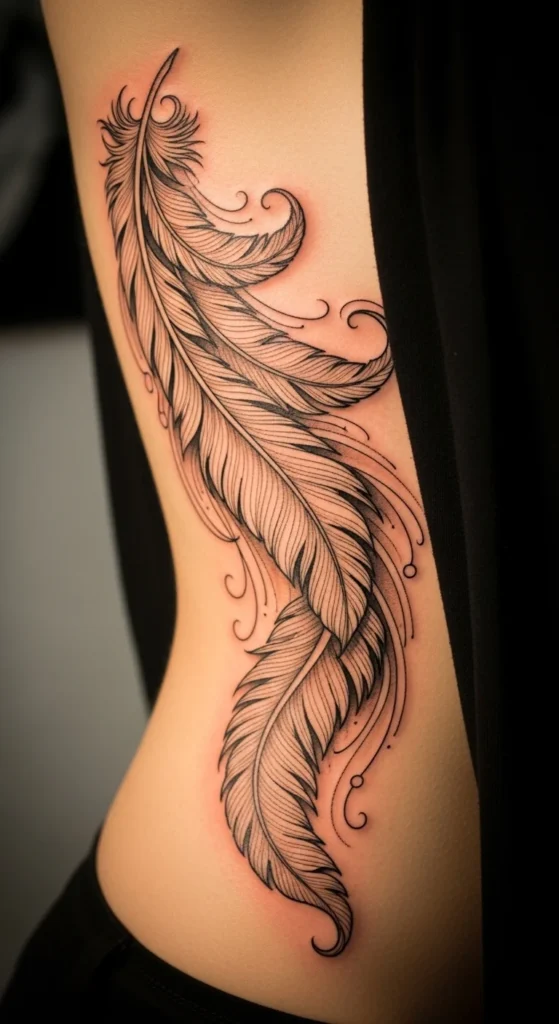 If you love the phoenix meaning but want something quieter, a feather-line phoenix concept is a great compromise. Long feather shapes can still represent rebirth without a full bird. Ribs suit long lines well because the curve adds drama.